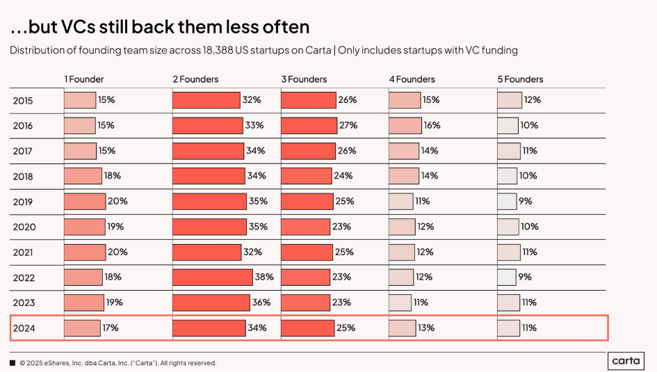 Esses dados mostram que, mesmo com o aumento do número de solo founders, os VCs continuam preferindo empresas lideradas por times com dois sócios ou mais. Não por conservadorismo, mas por assimetria de risco. Construir algo grande já é difícil em grupo. Sozinho, o risco emocional e de execução aumenta muito.