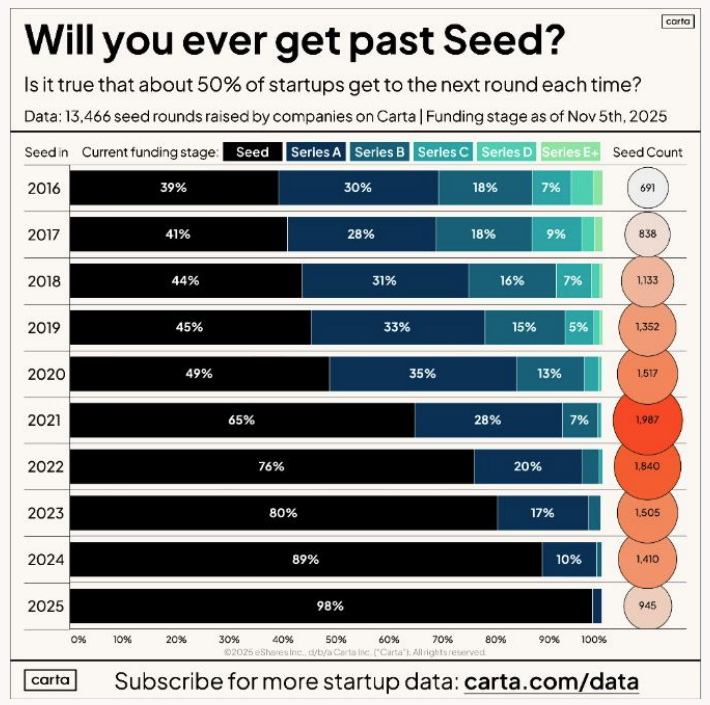 Outra conclusão do report é clara: o jogo de crescimento para startups continua duro. A taxa de graduação de Seed para Series B, nas safras mais antigas dos EUA, gira em torno de 15%. No Brasil, estimativas do Distrito e Sling Hub apontam algo entre 3% e 9%.
