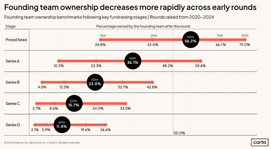Os founders que chegam longe na jornada (pós-Series D) terminam, em média, com 12% de equity. Mas existe uma grande variância, que está diretamente relacionada à eficiência de capital. Founders muito disciplinados, por exemplo, chegam a manter até 26% de participação nessa mesma etapa.