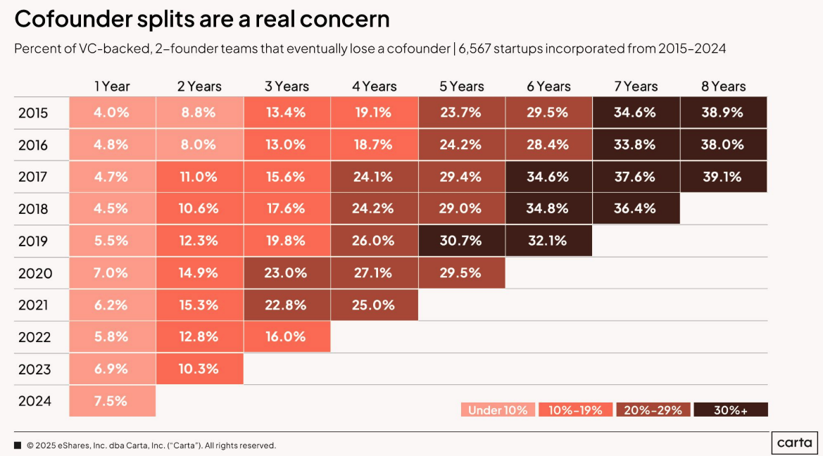 Segundo o relatório, após 5 anos da fundação, existe 30% de chance da empresa perder pelo menos um co-founder. Essa probabilidade sobe para 40% em 8 anos. Em times de três ou quatro fundadores, algum tipo de separação é quase certa. E se isso for mal planejado ou estruturado pode custar muito caro. Ou até custar a própria empresa.