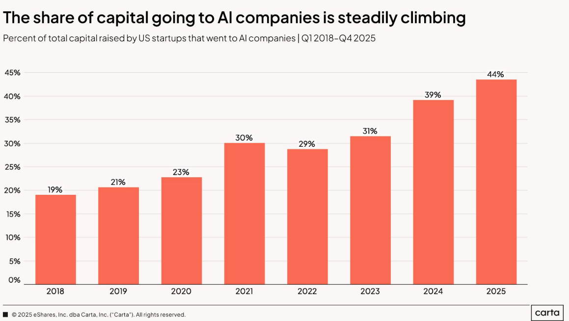Quase metade do funding em 2025 (44%) foi destinado para empresas de AI. Nos EUA só se fala nisso e, no Brasil, não é muito diferente. Claro que os mega rounds – rodadas com valores acima de US$ 100 milhões – representam cerca de 15% disso, mas mesmo assim é um número muito relevante.