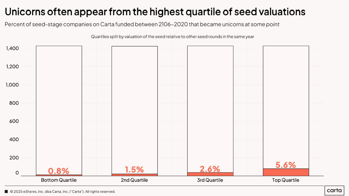 Nos EUA, empresas no top quartile de valuation têm três vezes mais chances de virar unicórnio do que as do segundo quartil. Mesmo assim, esses negócios do primeiro patamar possuem aproximadamente 5% de probabilidade de chegarem a um valor de mercado superior a US$ 1 bilhão.