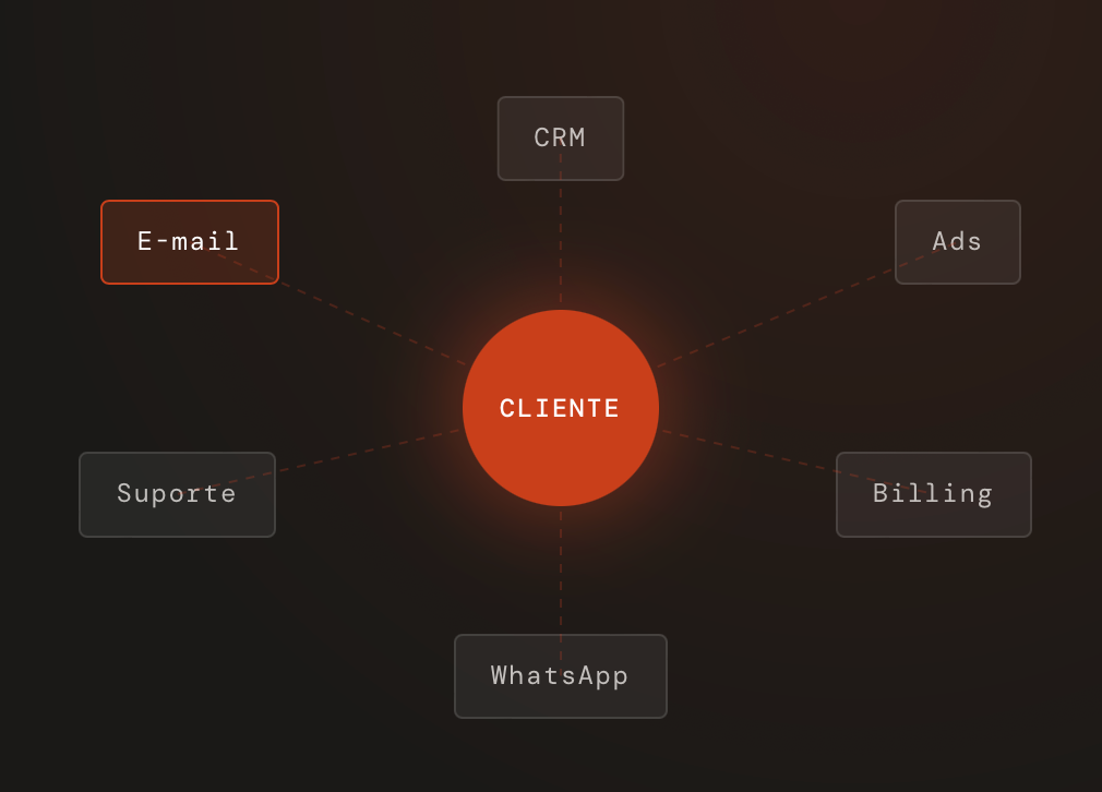 Em uma operação como essa, os dados de automação de marketing, usados para enviar e-mails de campanhas e promoções, raramente são integrados com os dados transacionais e com as conversas em redes sociais e WhatsApp. Normalmente, cada conversa é tratada de forma independente. Quem nunca recebeu uma campanha completamente desconectada do seu comportamento como consumidor?